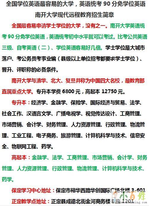 全国最容易申请学士学位的大学,没有之一小百姓网www.xbaixing.com。南开大学英语统考90分免学位英语,英语统考初中水平就可以考过来自www.xbaixing.com。比考公共英语三级、自考英语(二)、学位英语容易好几倍x.b.a.i.x.i.n.g.c.o.m。学士学位是大城市落户、考公务员考事业编(县级以上单位招考都要求学士学位)、晋升、评职称的必备条件小_百_姓_网。