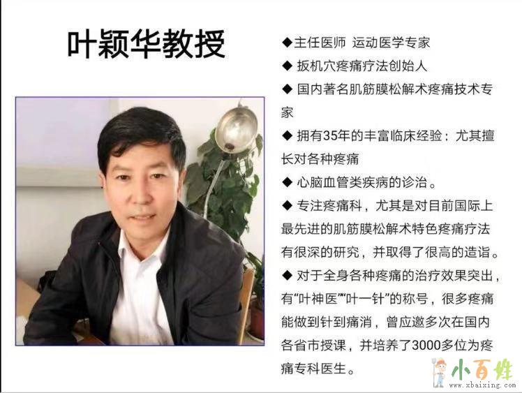 十、老师简介:叶颖华教授,同时从事中医、西医心脑血管研究30余年早期有幸接触肌筋膜疼痛专业,从此一心投入肌筋膜疼痛的研究中。国内外资料都有研习,后无以特拉维尔医生研究成果为主导,潜心深入研究,最终取得卓越成就在临床实践中,用肌筋膜松解术治疗疼痛收到了很好的效果。每年受益的疼痛患者数方人,几乎全部达到根除的效果。叶颖华教授意识到一人之力救人手水灭能力极有限,遂想到把肌筋膜松解术这一利人利己的专业广传全国,让更多人受益。几年来叶教授传播这一专业走遍祖国多个省份,各地区学生已达数千余人。为全国各地疼痛患者带去福音来自www.xbaixing.com。所谓赠人玫瑰,手有余香,在传授这一治病救人技术同时,叶教授也受到全国客地学生和患者的一致好评和认可,广受赞誉。主任医师运动医学专家扳机穴疼痛疗法创始人国内著名肌筋膜松解术疼痛技术专家拥有35年的丰富临床经验:尤其擅长对各种疼痛.心脑血管类疾病的诊治。专注疼痛科,尤其是对目前国际上最先进的肌筋膜松解术特色疼痛疗法有很深的研究,并取得了很高的造诣。对于全身各种疼痛的治疗效果突出,有“叶神医“叶一针”的称号,很多疼痛能做到针到痛消,曾应邀多次在国内各省市授课,并培养了3000多位为疼痛专科医生。
